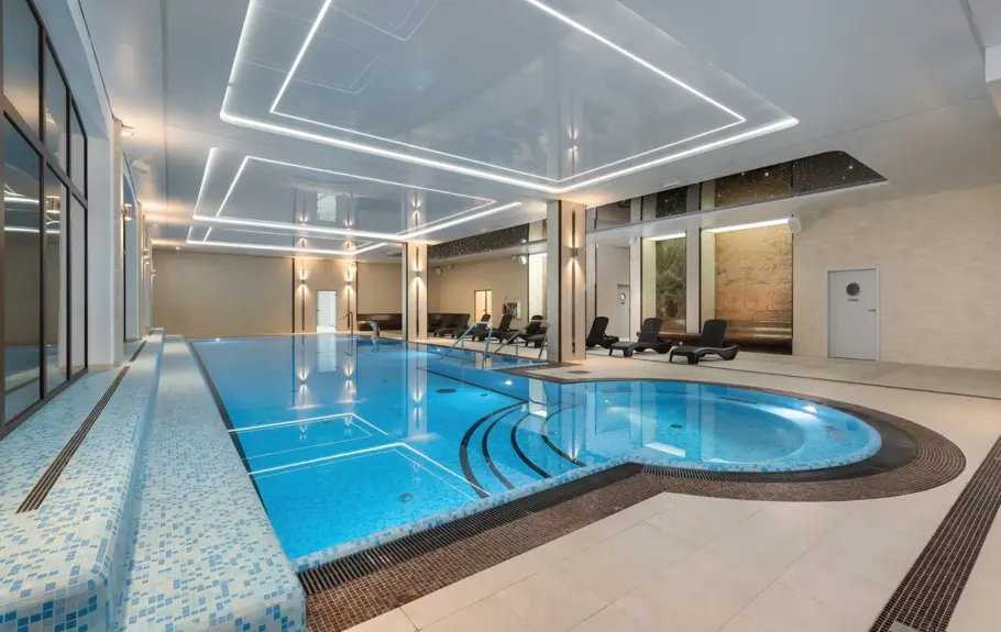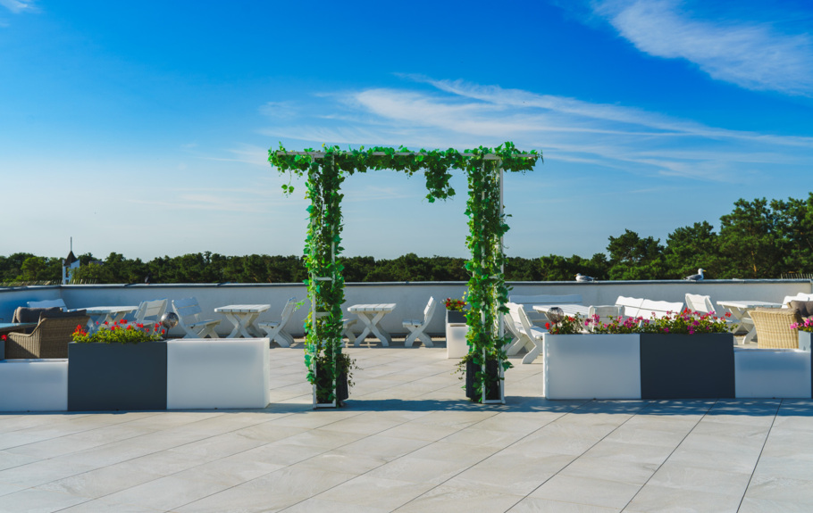 Sky bar i taras z basenem na dachu to idealne miejsce do relaksu i spędzania czasu na świeżym powietrzu. Znajdujący się na szczycie budynku taras oferuje zapierający dech w piersiach widok na korony drzew, co sprawia, że atmosfera jest niezwykle magiczna i relaksująca.