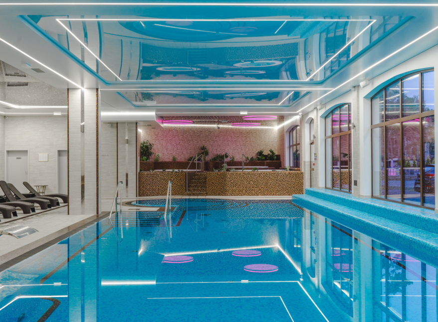 Tři vířivé vany pro pět až šest osob se nacházejí na vnitřním pódiu v bazénové hale, s výhledem na les a rekreační bazén.